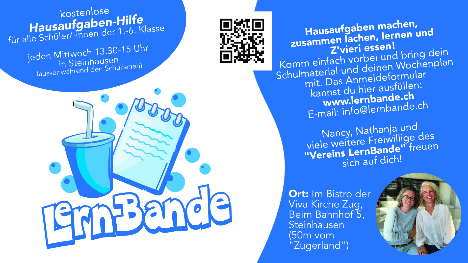 Die LernBande ist ein kostenloses Angebot für Primarschüler in Steinhausen und Umgebung. Wir bieten einen Ort, an dem Hausaufgaben nicht nur erledigt, sondern mit Freude angegangen werden in einem offenen und herzlichen Umgebung, in der jedes Kind willkommen ist. Während der Schulferien findet kein Angebot statt.